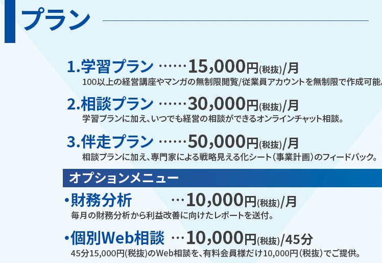 相談プラン:月額30,000円(学習プランに加え、経営のオンラインチャット相談が随時可能)