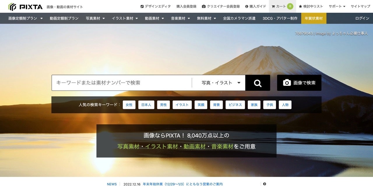 「PIXTA」はプロ・アマチュア問わず誰もが自ら制作した写真・イラスト・動画・音楽をインターネット上で売買できるデジタル素材のマーケットプレイスとして2006年5月にスタート。日本の人・文化の素材を強みに、豊富なイメージ画像・動画・音楽を取り揃え、日本を中心にクリエイティブ制作分野の人々から高い支持を受けています。また最近では、機械学習をおこなう企業や学術機関向けに教師データとしての画像・動画素材の提供や、アノテーションサービスも積極的におこなっています。