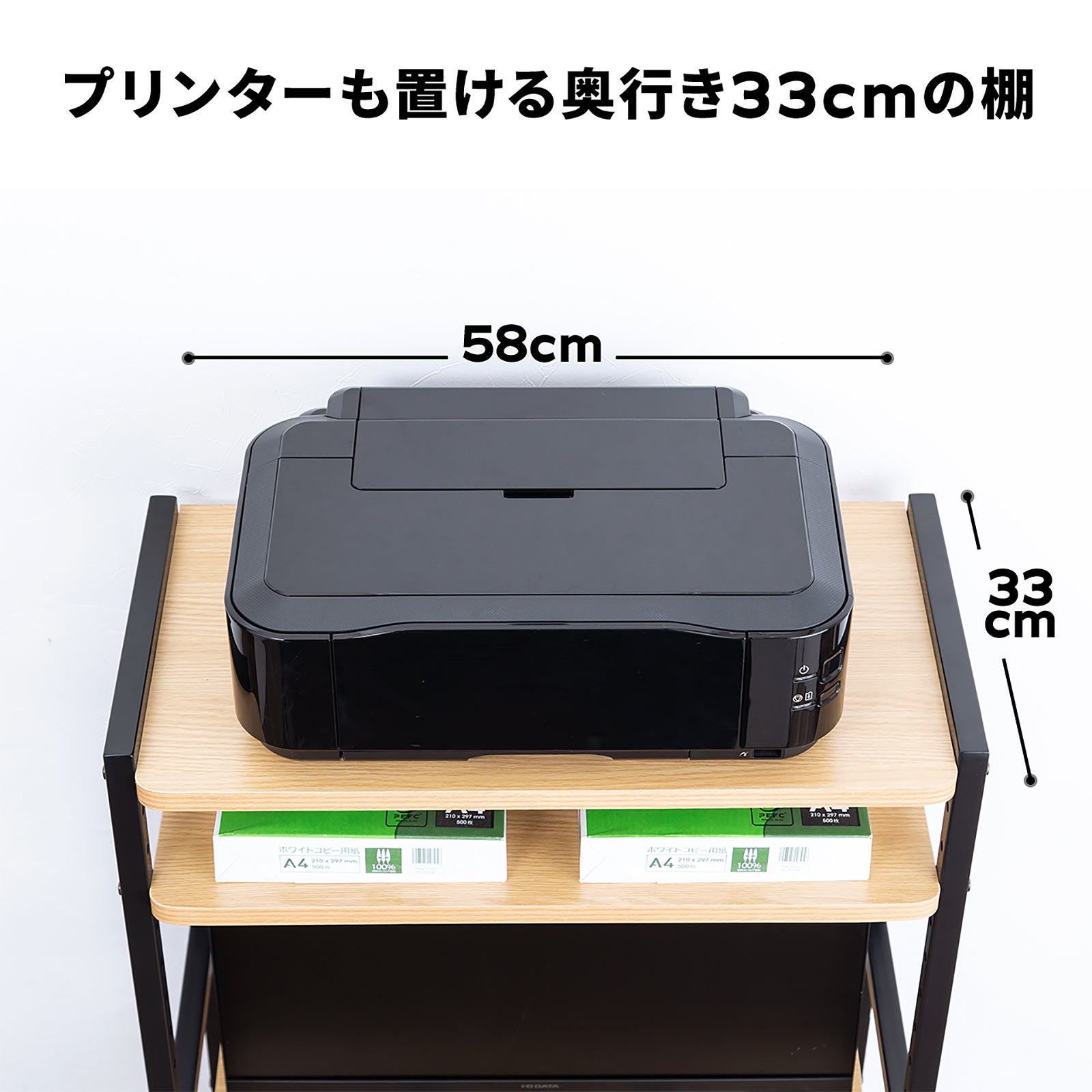 耐荷重10kg、約幅58cm、奥行33cmの棚が4枚付属しています。プリンターも設置することができます。