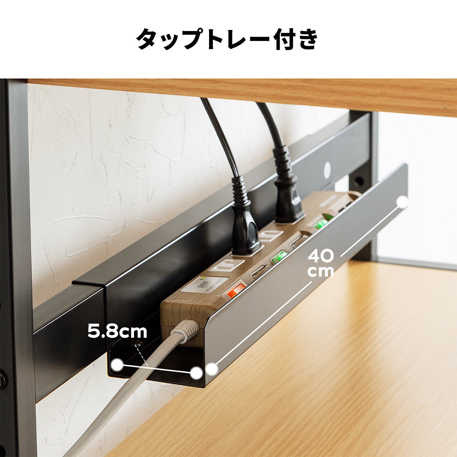 タップトレー付きで、電源タップやケーブルをまとめることができます。