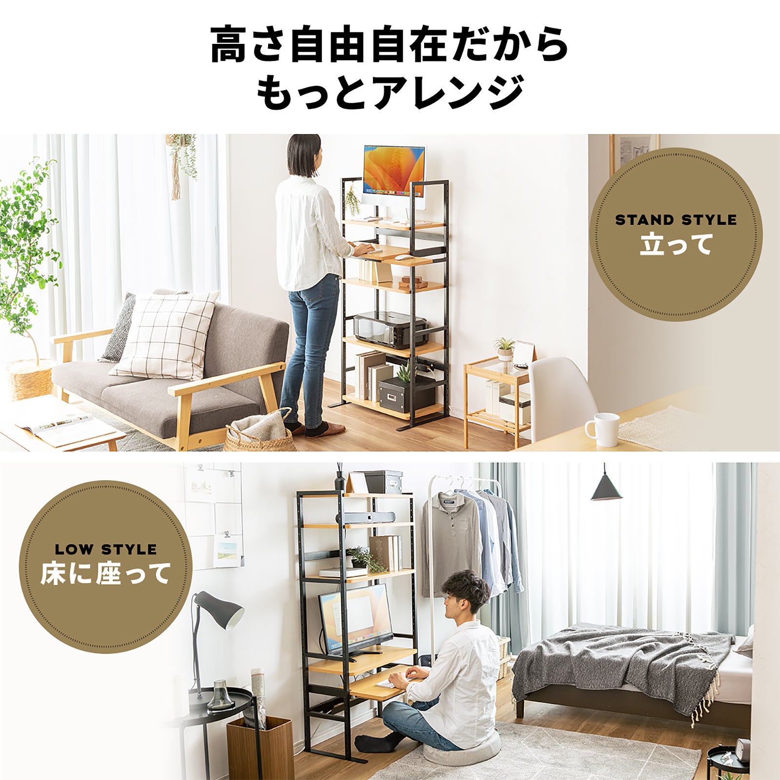 体型、収納、用途に合わせて、ぴったりの高さに調整することができます。棚を調整することで、ローデスク、スタンディングデスクとして使用できます。