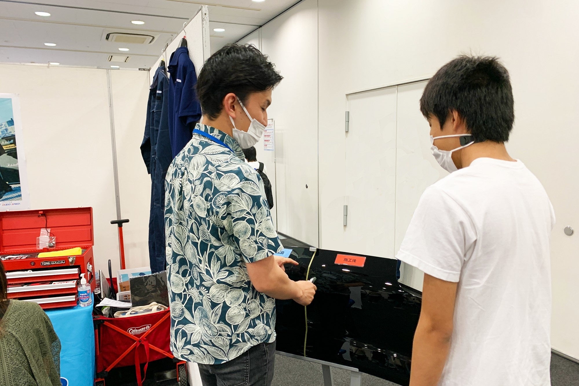 新車・中古車販売店の株式会社グッドスピード様では、お仕事説明後に希望者に対して、傷をつけてもきれいに消える塗装を施した車体に触れてもらい塗装加工の効果を体感してもらいました。