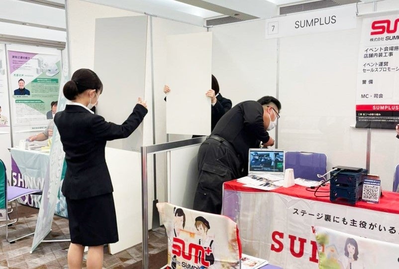 イベント会場施工・店舗内装工事を行う株式会社SUMPLUS様では、イベント設営用の資材を使用してカウンターづくりの体験を行いました。