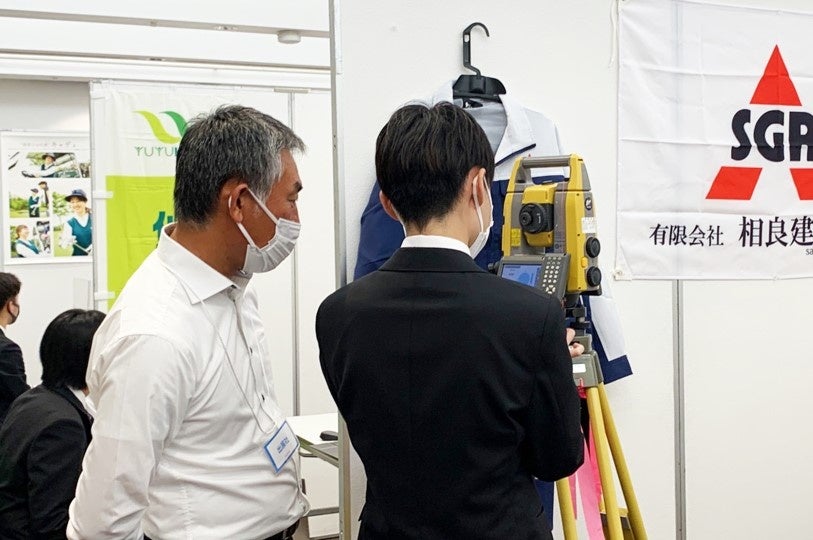土木工事・舗装工事などの公共工事をはじめ、外構工事・宅地造成工事・伐採造園工事・解体工事を行う有限会社相良建設工業様では、工事現場の詳細情報を得るための測量機器の操作の体験を行いました。