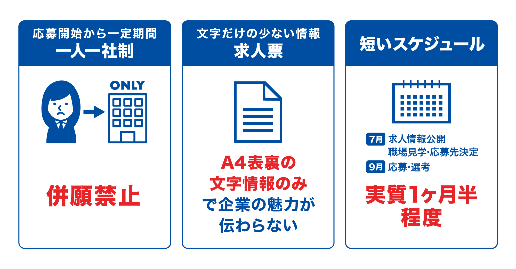 こうした就職活動は学業を優先し短期間で内定を得ることができる重要な仕組みです。一方で、文字情報で記載している求人票では、入社してからどんな仕事をするのか、どんな社員とどんな職場で働くのか、会社はどんな想いやビジョンを持って運営しているのかなど働くイメージがわかず、十分な企業研究ができないまま応募先を絞り込んでいるケースがあります。加えて実質1か月半程度の短期間で応募先企業を決めなければなりません。そのことで仕事に対する不安やミスマッチ、入社後のギャップが生まれると、入社1年目の「超早期離職」の課題の一因となりえます。