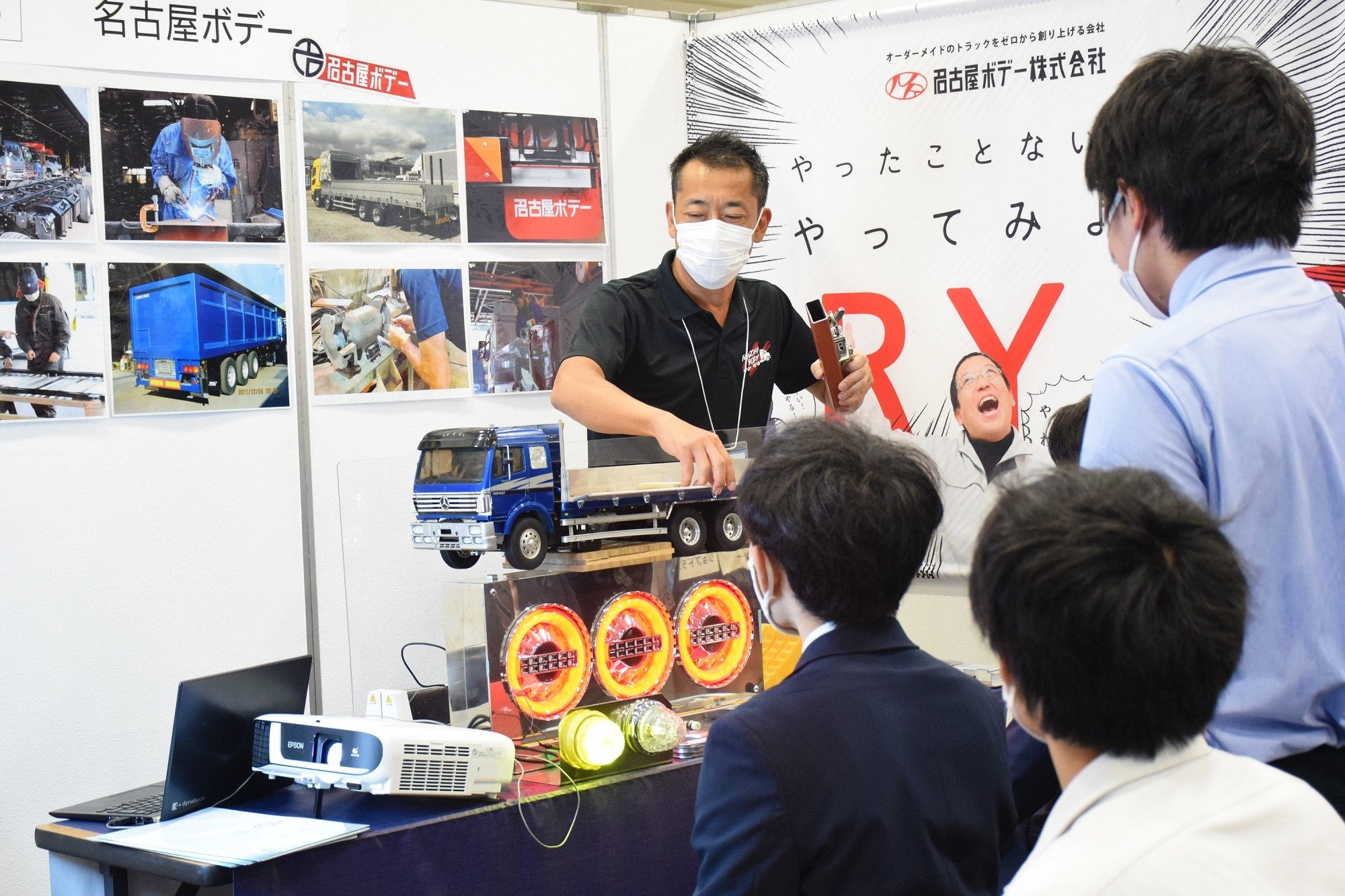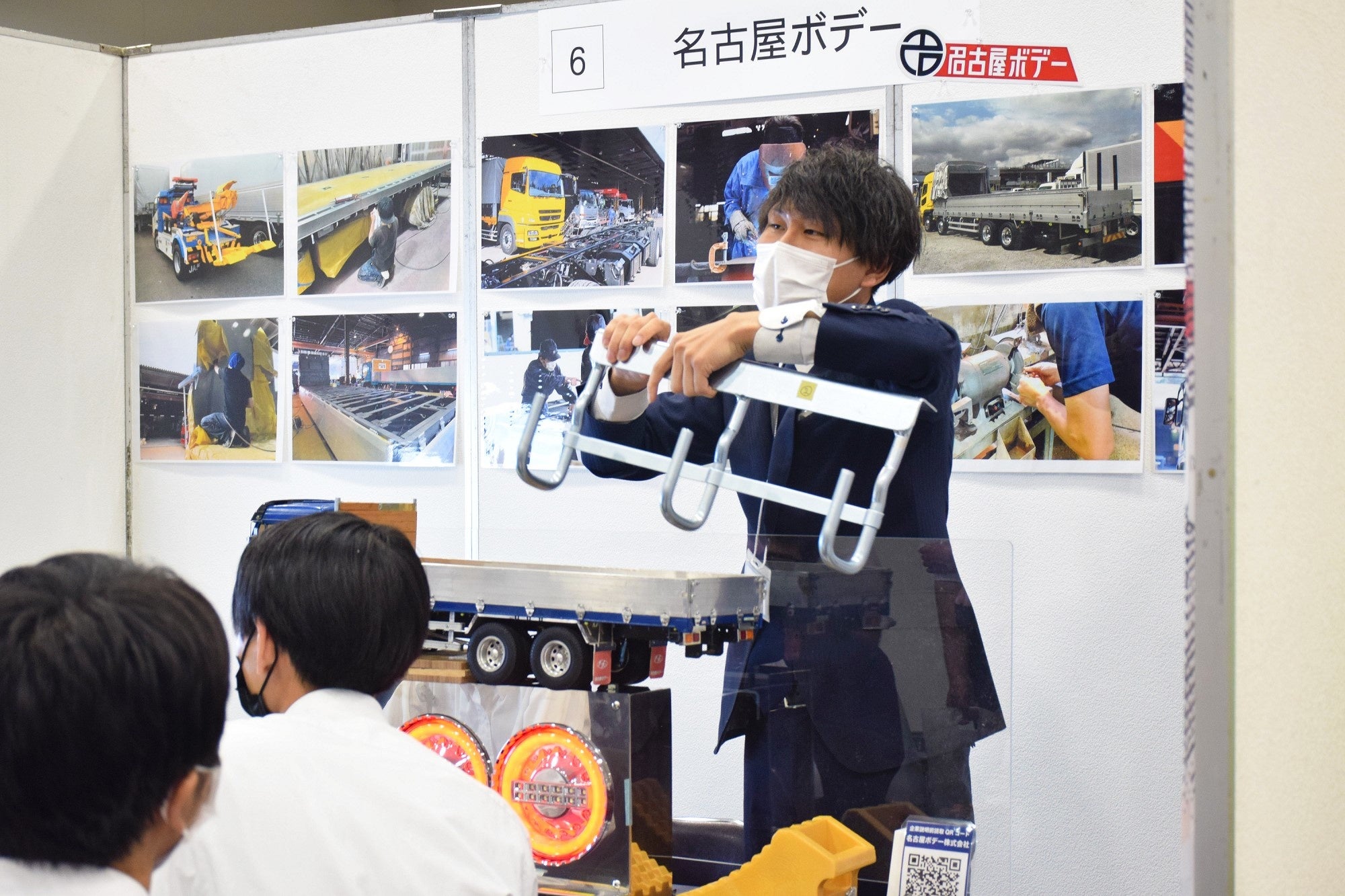 トラックボデー(荷台)のオーダーメイドなどを行う名古屋ボデー株式会社様では、「この部品、車体のどの部品か?」というクイズを行い、ミニサイズのトラックを使い説明を行いました。