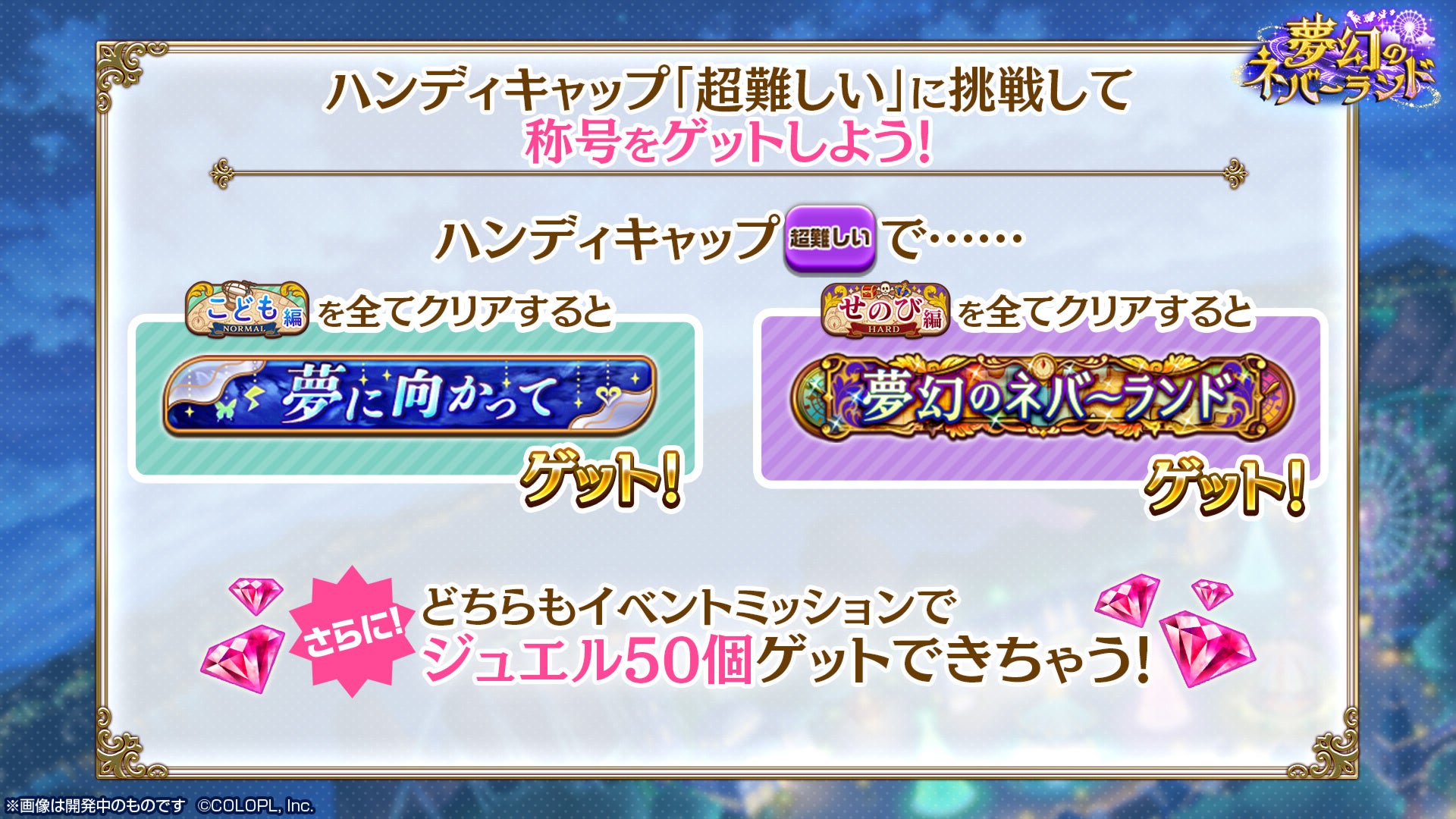 本イベントは、「こども編」「せのび編」の難易度をご用意しております。「こども編」ではアクションスキルが使い放題になる代わりに、キャラクターの体力が半分になり、さらに敵が強力な攻撃を仕掛けてくる、爽快感と緊張感のあるクエストとなっております。一方で「せのび編」ではキャラクターの最大体力と攻撃力がUPしますが、アクションスキルの再使用時間が増加し、クエストに制限時間が追加されるなど、より難しいクエストとなります。それぞれの難易度のクエストをハンディキャップ「超難しい」ですべてクリアすると特別な称号「夢に向かって!」「幻夢のネバーランド」とジュエルを合計100個を獲得することができます。