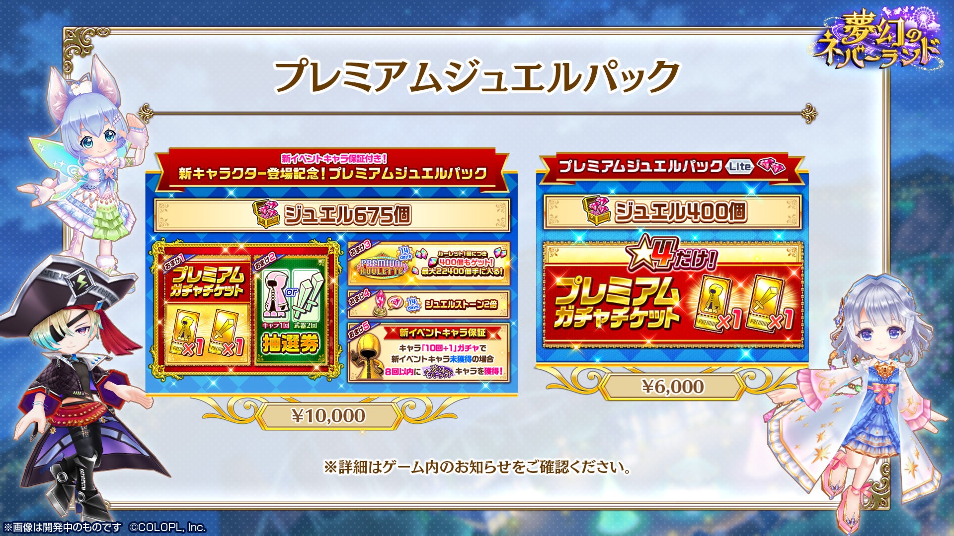 ・内容物(1回目):「ジュエル」675個、「キャラ1体or武器2個抽選券」1枚、「プレミアムキャラガチャチケット」1枚、「プレミアム武器ガチャチケット」1枚、「新イベントキャラ保証」、「プレミアムデイリールーレット」14日間、「ジュエルストーン2倍」14日間