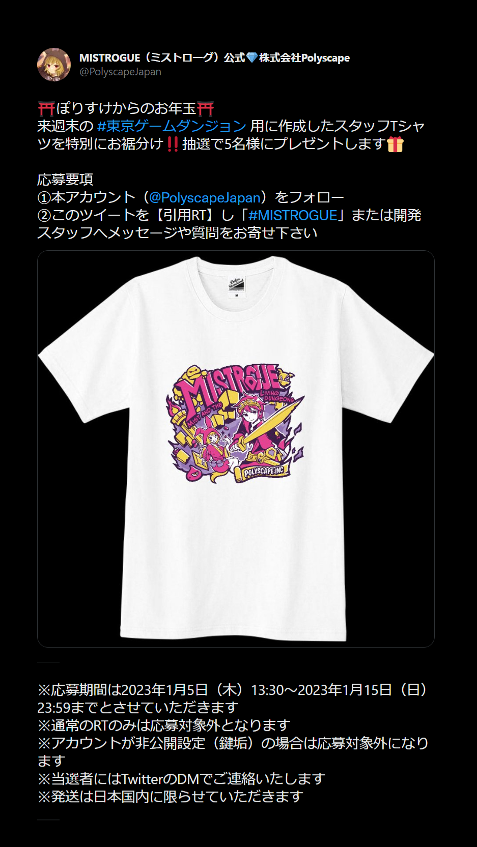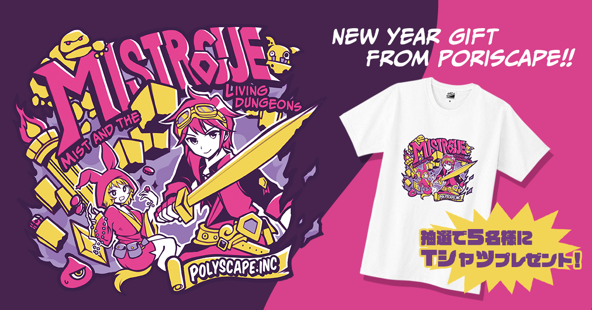 今回はお年玉企画として、1/15(日)に行われるインディゲームイベント「東京ゲームダンジョン2」に合わせて作成した、Polyscapeスタッフとおそろいの「MISTROGUE ミストと生けるダンジョン」オリジナルTシャツ(※非売品)を抽選で5名様にプレゼントします。以下の応募要項をよくご確認の上、ご応募下さい。