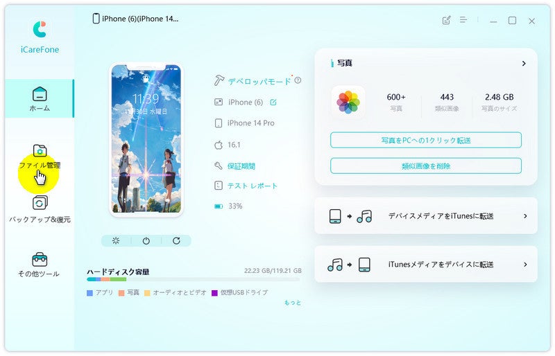 iPhone/iPad/iPodのデータ管理・転送に特化したマネジメントソフトウェアであるiCareFoneは、iTunesの代わりとしてiOSデバイスとPC、Mac間での自由なデータ転送が可能です。機種変更の時に、データ転送の失敗、データの損失、長いデータ転送時間などに悩んでいる方はいませんか?iCareFoneはiPhoneとiOS 16のデータ転送をサポートしており、異なるデバイス間のデータ転送を安全かつ効率的に行うことができます。ぜひ試してみてください!