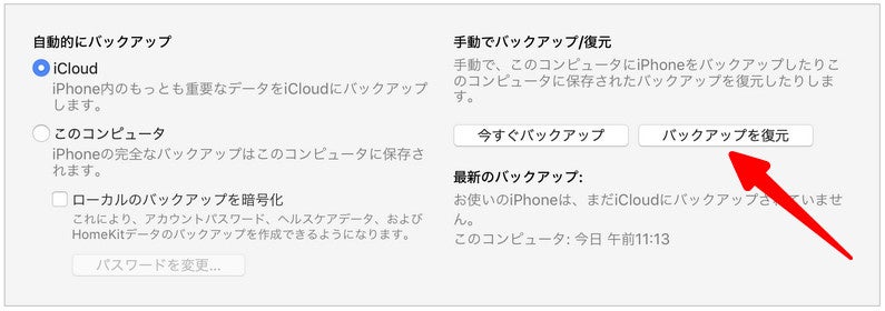 ●バックアップ項目で「バックアップを復元」を選択します。以前iTunesでバックアップしたデータは既に新しいiPhoneに転送完了です。
