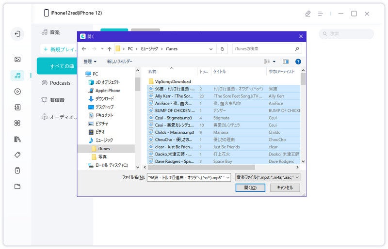 step2:上部のオプションバーで「追加」>「ファイル」を選択し、iPhoneに入れたい音楽ファイルが保存されているフォルダを開きます。転送する曲がチェック出来たら画面右下の「開く」をクリックします。