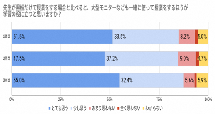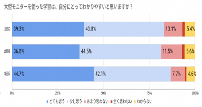 「大型モニターを使った学習は、自分にとってわかりやすいと思いますか?」という質問では、最終的に86.8%が「わかりやすい」と回答し、ICT機器を活用した授業に対して「わかりやすい」と答える生徒が多く、学びに対するモチベーションが向上していることが分かりました。