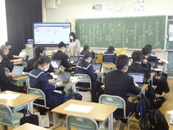 スマートスクール推進モデル校である加古川市立加古川中学校では、ICTを活用した授業に関して、生徒にアンケート等を実施しました。
