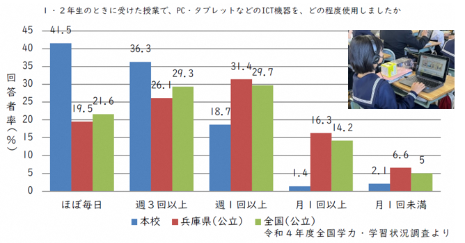 「1、2年生の時に受けた授業で、PC・タブレットなどのICT機器をどの程度使用しましたか」という質問には41.5%の生徒が「ほぼ毎日使用した」と回答しており、全国平均21.6%の約2倍近くに達し、日々の授業において頻繁に活用できていることがわかりました。(全国学力・学習状況調査より)