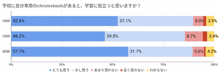 また、黒板だけの授業だけでなく、ICT機器を使うことが、学習に役立つと考える生徒が87%以上、学校に自身専用のICT端末があると学習に役立つと感じている生徒が89%以上を占めており、ICTの活用が学習効率を高めると考える生徒がかなり多いことも分かりました。