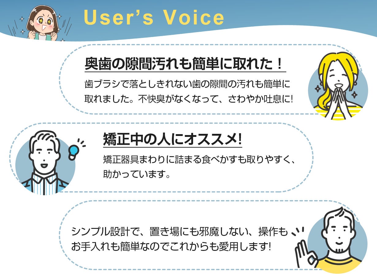 健康で美しい歯を目指するため、歯ブラシで取り切れない歯垢を可能な限りしっかりと除去可能な口腔洗浄器をぜひ使ってみてください。