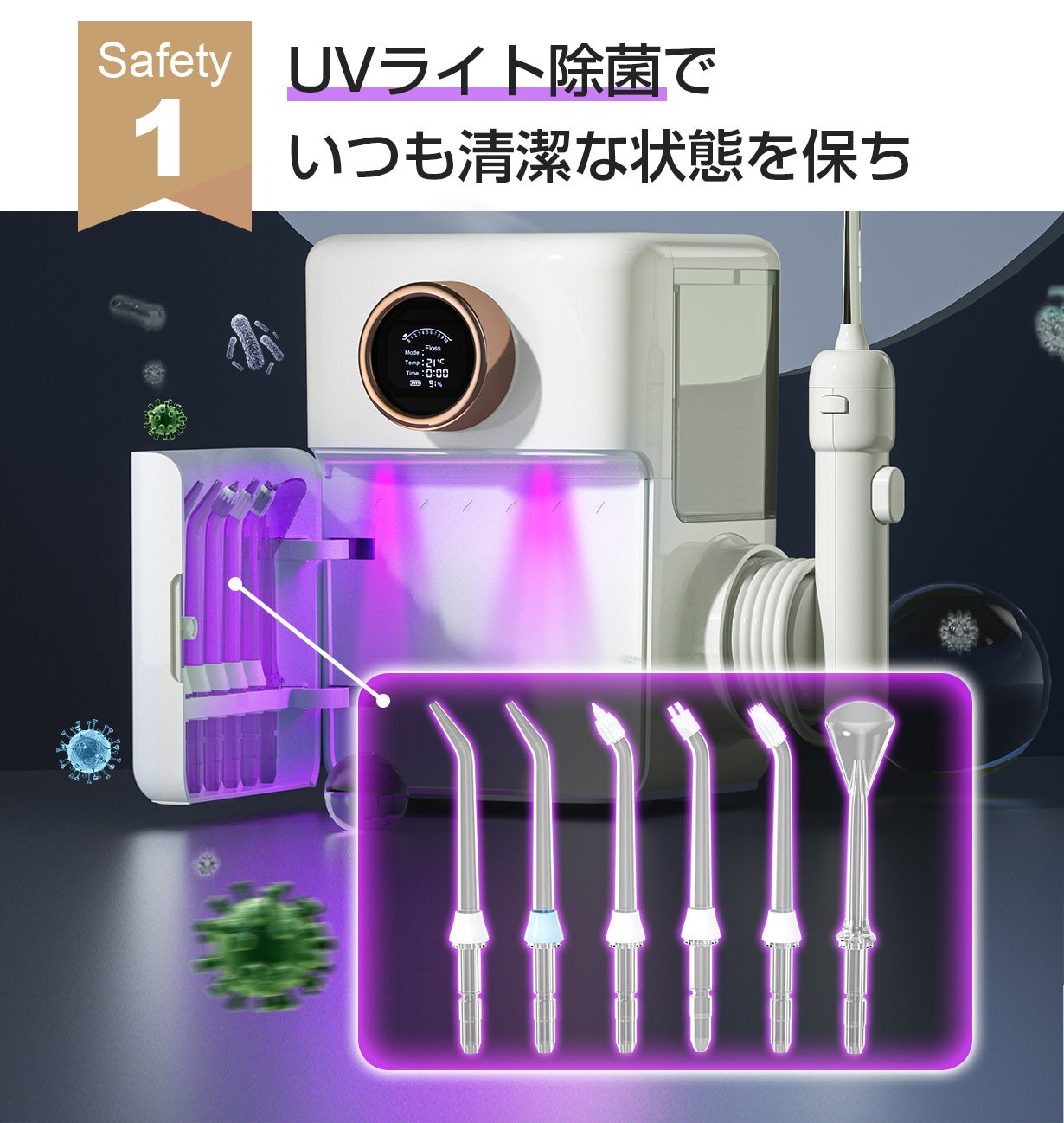 ノズルの除菌用UVライト&水の浄化用抗菌カートリッジを搭載しました!いつでも清潔に口腔洗浄ができます。