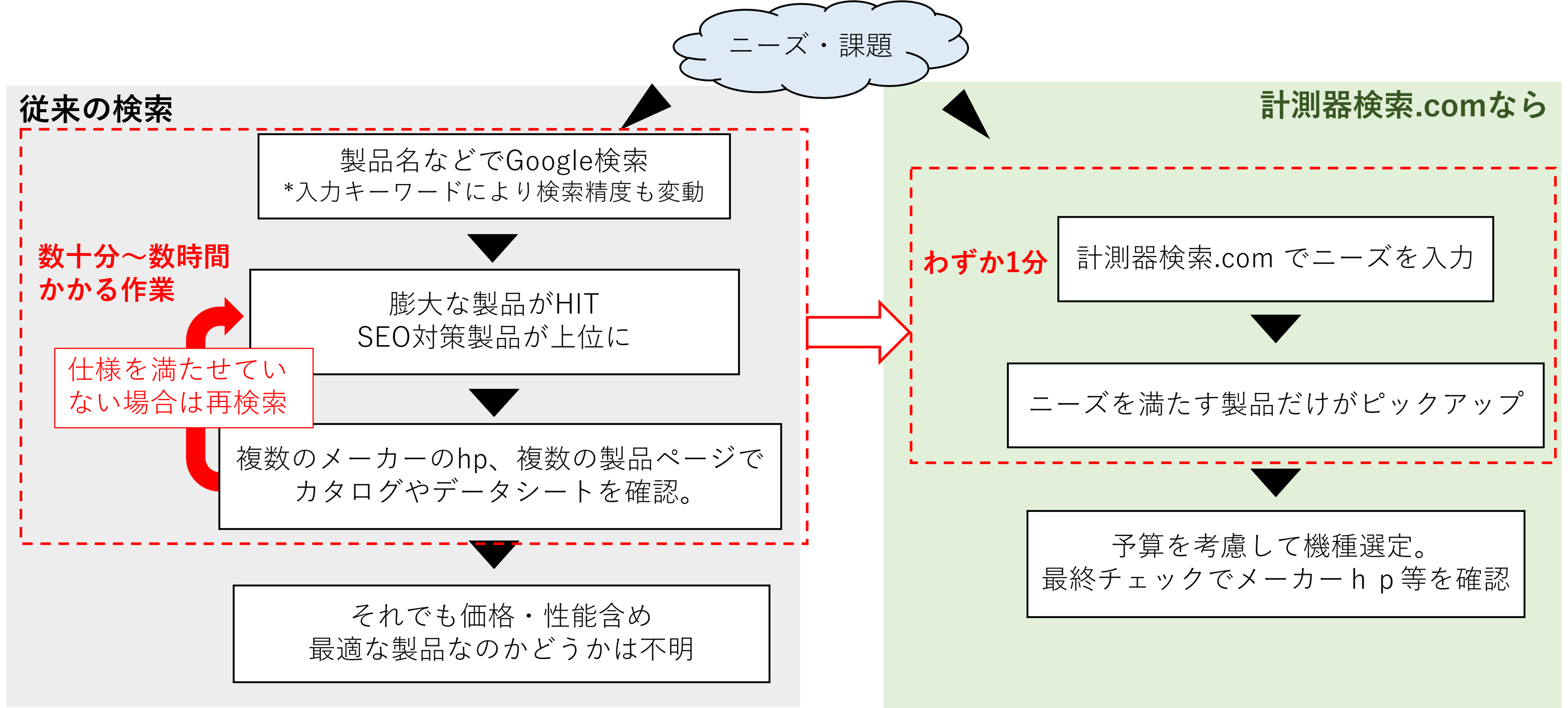 「計測器検索.com」は従来からある、キーワード検索やカテゴリー検索だけでは無く、ユーザーが必要とする測定対象や値を選択&入力する事により最適な計測器がピックアップされるという業界唯一の機能を持ったウェブサイトです。ユーザーやディーラーの計測器の調査時間を大幅に短縮可能で、創出した時間を有効的に使い企業の生産性向上に貢献するというコンセプトで運営をしてきました。