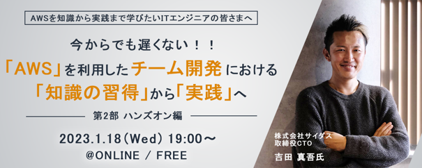 本セミナーは、「AWS」を利用した最新のアーキテクチャと、それをチーム開発するための「ローカル開発環境」から「CI/CDパイプライン」までを実践的に学ぶことのできるセミナーです。株式会社サイダス 取締役CTO 吉田真吾氏を講師に迎え、2部構成で実施。第1部は2022年11月に開催した座学編(インプット編)として、実践に必要となる知識をメインに開催いたしました。