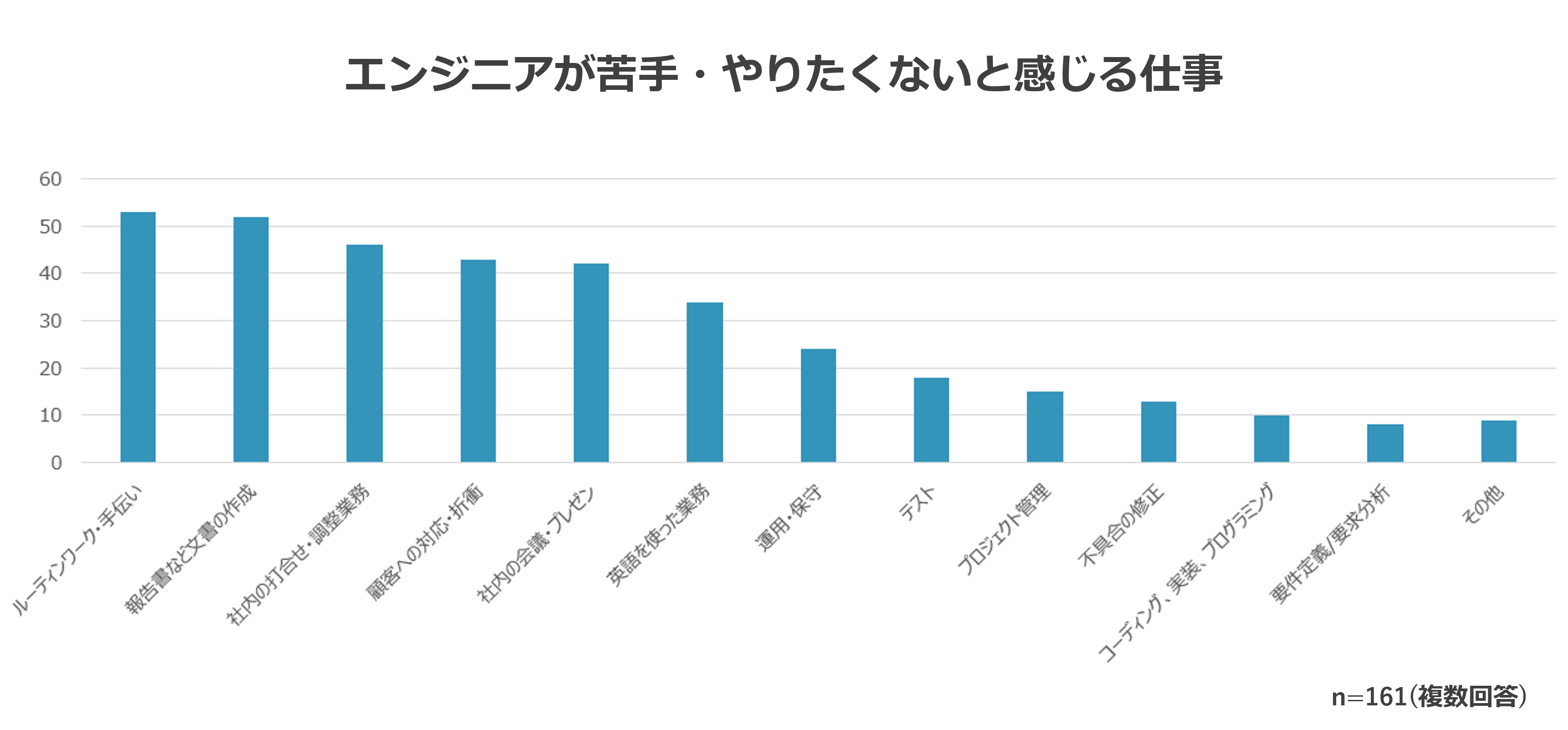 ・エンジニアの苦手・やりたくないと感じる仕事上位は「ルーティンワーク・手伝い」、「報告書などの文書の作成」