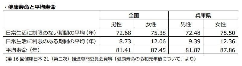 また、健康寿命と平均寿命はそれぞれ全国平均同等で、男性は9.39、女性は12.36年の「日常生活に制限のある期間」があります。