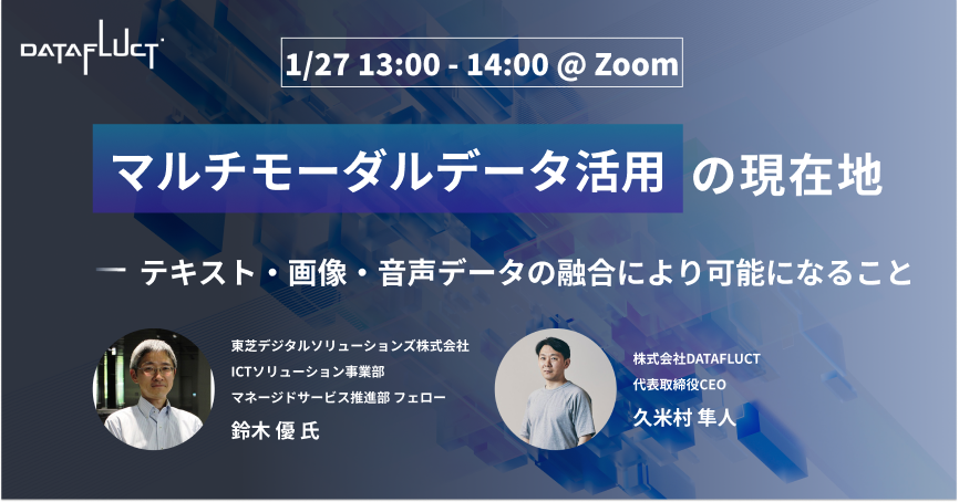 株式会社DATAFLUCTは「データを商いに」をビジョンに掲げ、埋もれていたデータから新たな価値を生み出し、社会課題を解決するデータビジネスパートナーです。非構造化データをはじめ、データの形式にとらわれない「マルチモーダルデータ活用」に強みを持ち、データの収集・蓄積・加工・分析を一気通貫で実現します。