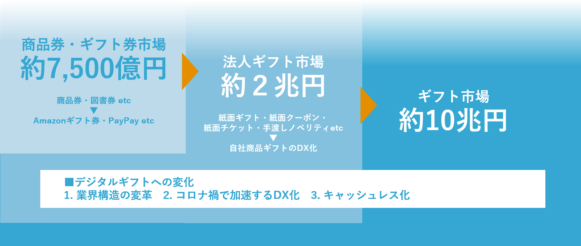 従来のギフト券はもちろん、キャッシュレス化・コロナ禍によって著しく進むDX化に伴う未来のギフト・マネーサービスにも随時対応、約10兆円の国内ギフト市場を網羅していきます。
