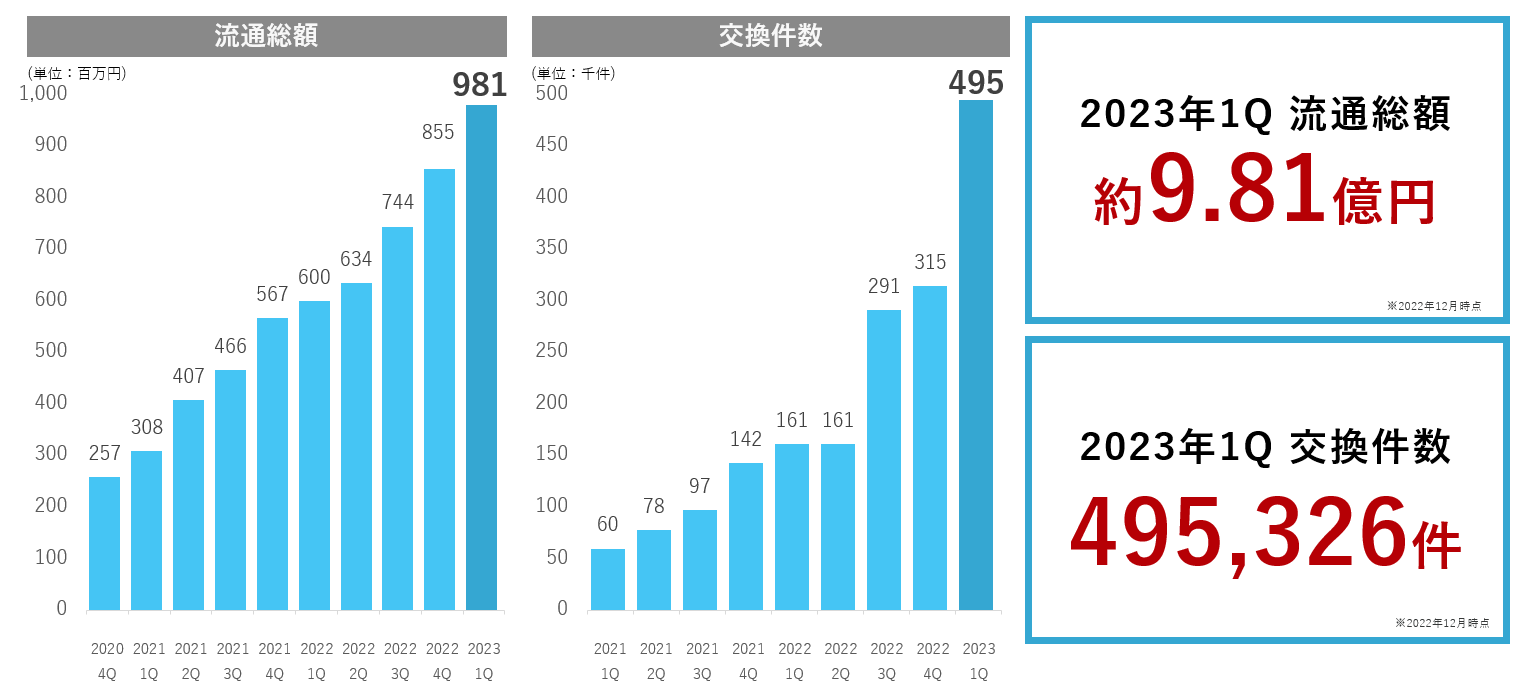 2023年9月期通期目標である流通総額前期2倍成長に向け、営業人材採用、代理店契約の推進、既存クライアントへの導入支援体制の構築など、営業活動強化の動きを積極的に行った結果、「デジタルギフト®」及び「デジタルウォレット」の流通総額、交換件数が共に増加し、2023年9月期第1四半期に過去最高となる9.8億円、49万件をそれぞれ突破することができました。引き続き、継続的にご活用いただけるような提案を展開し、アカウント毎の利用率と利用額の向上を目指してまいります。