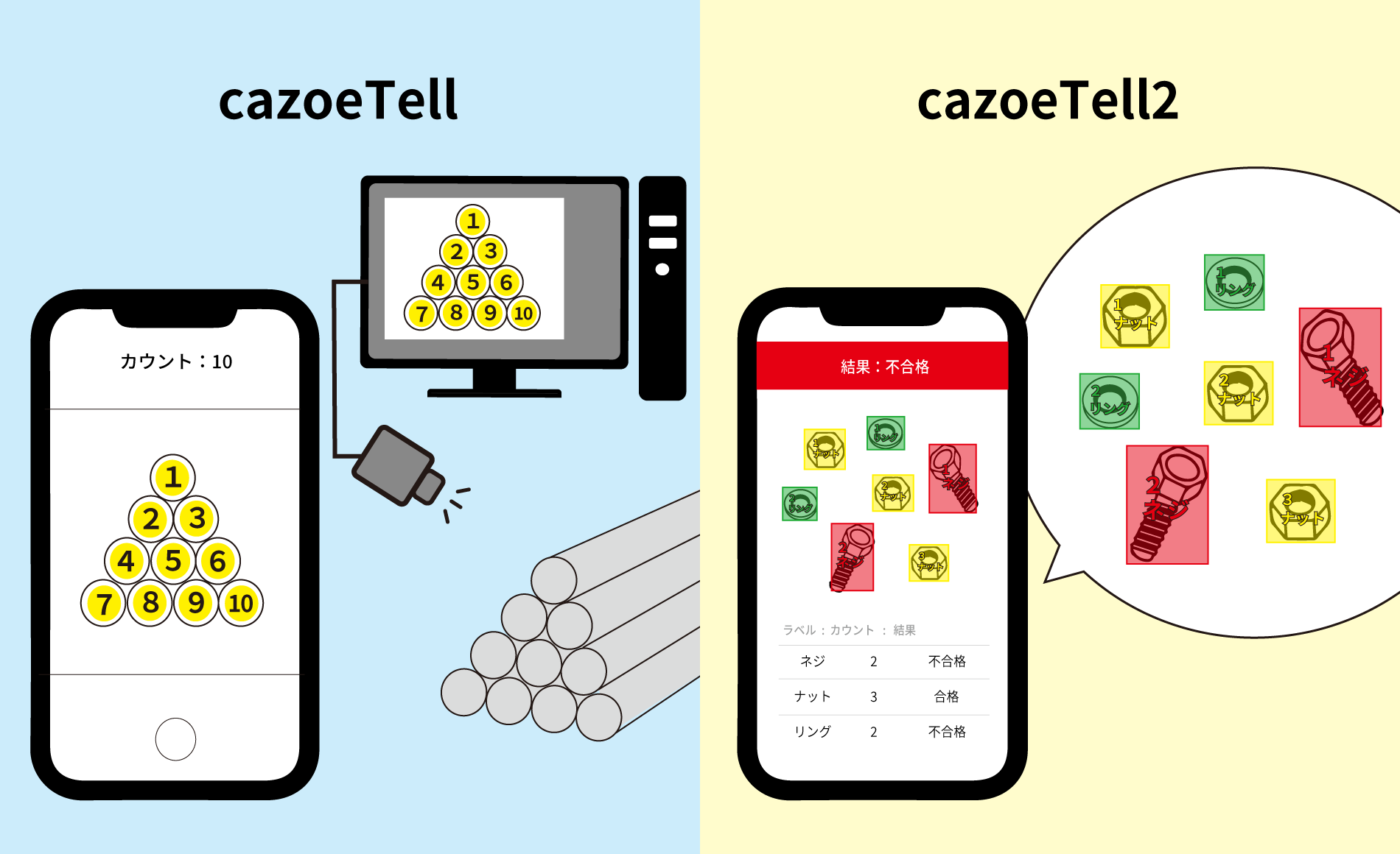 昨年5月にcazoeTellをリリースし、「分類ごとにカウントができないだろうか?」「何種類も同時にカウントしたい!」というお客様の声を受け、これまでの計数機能に分類・合否判定機能を追加しcazoeTell2として新たにリリースをしました。cazoeTellは本数や個数のカウントに特化し、cazoeTell2は分類してカウントができるアプリケーションとなっており、用途に応じて使い分けることが可能です。