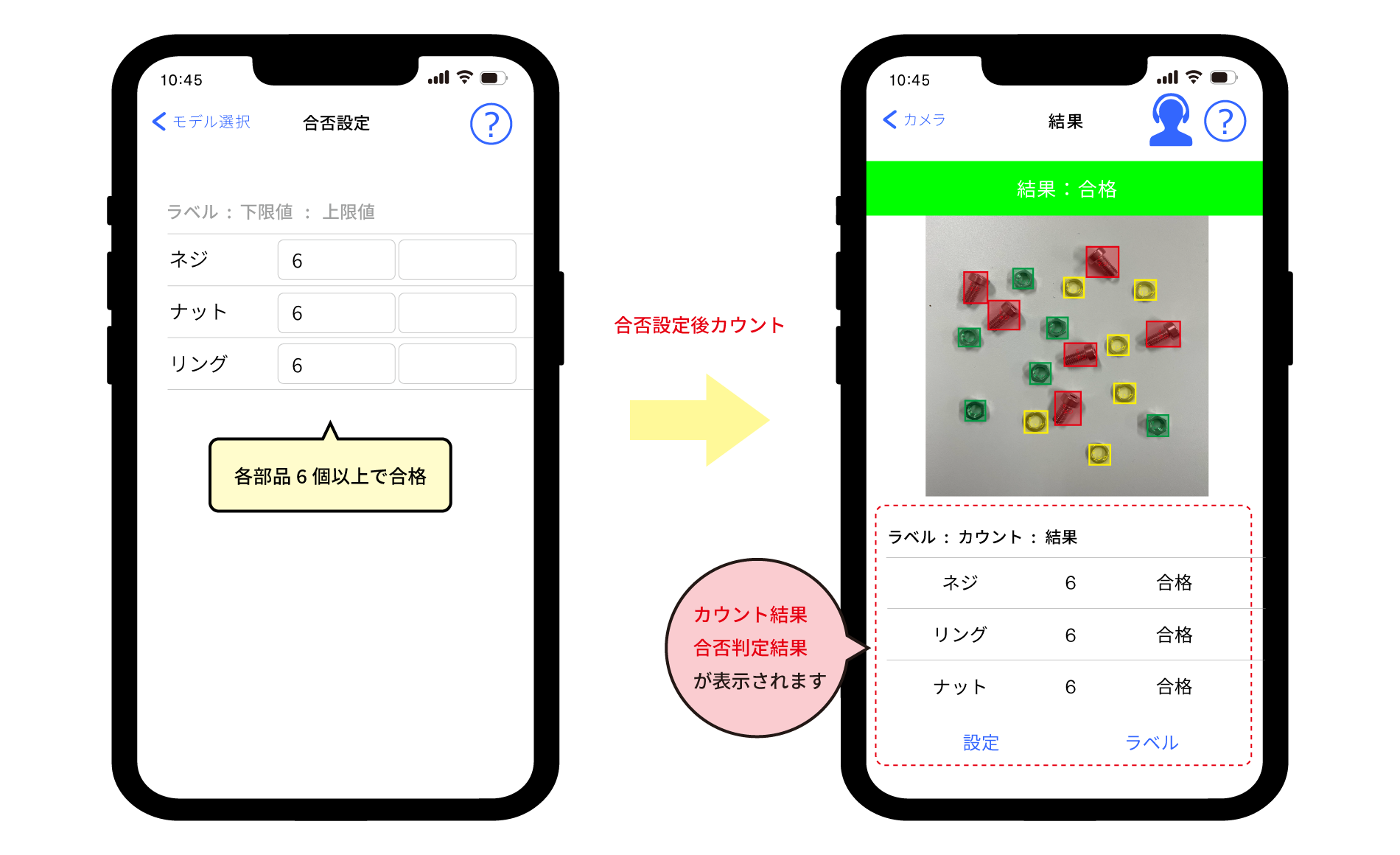 『各部品3個で合格』『1種類欠品しているから不合格』など合否判定ができる為、在庫管理や欠品検査の作業効率が上がります。合否判定はカウント結果として表示されます。