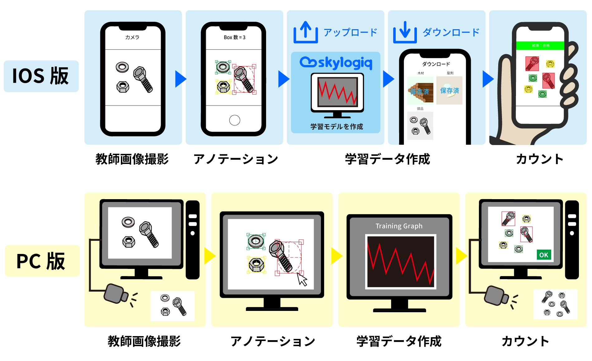 気軽にスマホ内で分類カウントができるIOS版と、カメラを接続し撮影しながらリアルタイムでカウントが可能なPC版があります。IOS版は教師画像を撮影・アノテーション(※)を行い弊社サーバーにアップロードすることでカスタム学習モデルを作成し、ダウンロードしたモデルにてカウントを行うことができます。PC版では撮影・アノテーションを行い、カスタム学習モデルを作成は『学習:開始』を押すだけ。アノテーションを行った教師画像を弊社サーバーへアップロードする必要がありません。またPC版で作成した学習モデルをサーバーにアップロードすることで、IOS版で学習モデルがダウンロードでき、スマホでカウントすることができます。