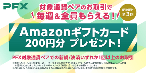 キャンペーン期間中にパートナーズFX対象通貨ペアで、新規・決済どちらか1回以上のお取引を達成された方へ、もれなくAmazonギフトカード200円分をプレゼントいたします。3週連続で開催いたしますので、是非お取引にお役立て下さい。