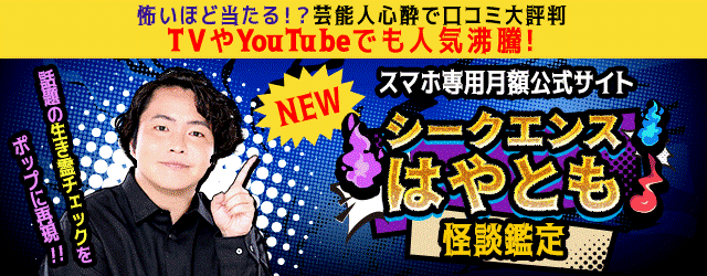 YouTubeチャンネル登録者数20万人超え・数々のTV番組にも出演し人気沸騰中の占い師・シークエンスはやとも先生が監修する、スマホ専用月額占いサイトです。芸能界でも話題の「生き霊チェック」を、独自の解釈やモチーフを使用して、“怪談風”かつ“ポップ”に再現し、あなたの運命や現実を開運に導くためのメッセージをお伝えします。