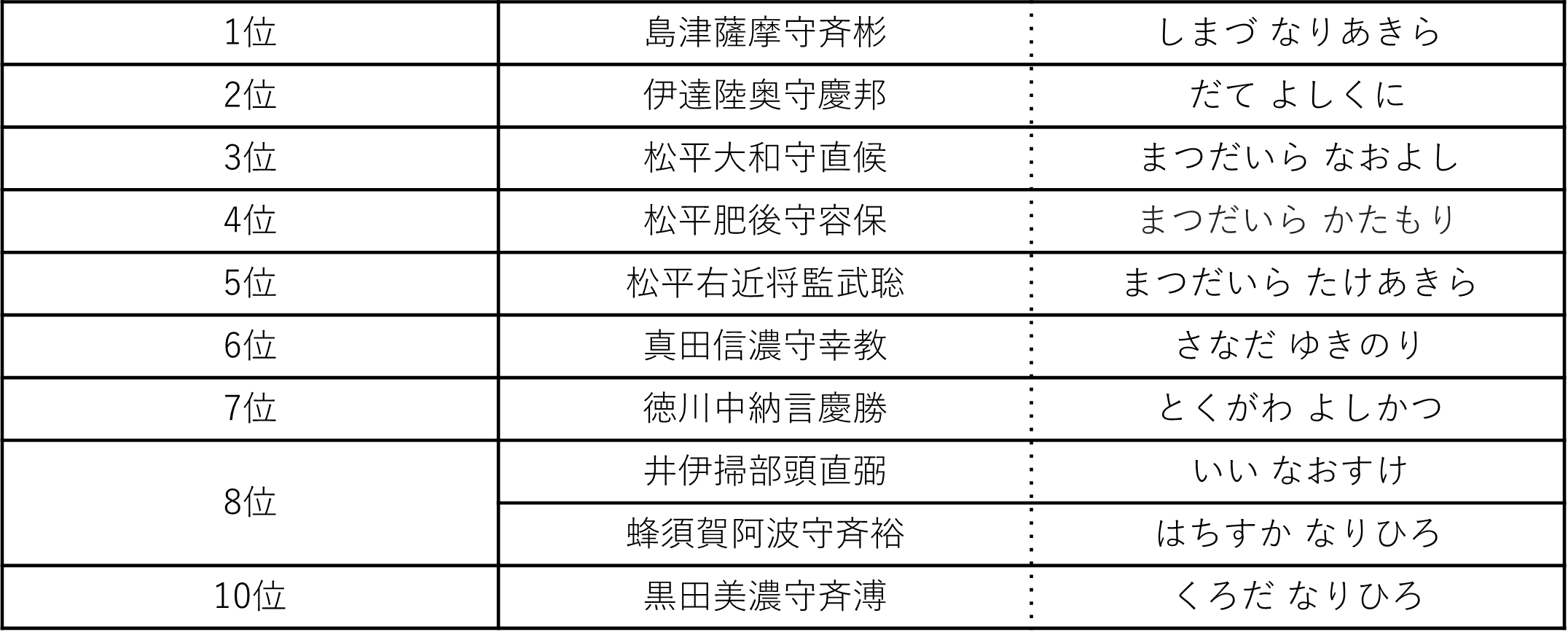 薩摩藩の名君・島津斉彬公が堂々の1位となりました。その他、戊辰戦争時の会津藩主である松平容保公や、桜田門外の変で没した井伊直弼公など、幕末の歴史を動かした人物は書籍や映像作品で取り上げられる機会も多く、頻繁に検索されています。また2位の伊達慶邦公・3位の松平直候公はそれぞれに、本アプリに掲載されている古地図が作成された当時(1856年・安政3年)の仙台藩主・川越藩主です。このように人物名の検索上位では、歴史の教科書などでなじみ深い姓もあるのではないでしょうか。戦国時代末期から江戸時代に掛けて歴史の表舞台に立ってきた武将や藩主の末裔が多く並ぶ結果となりました。