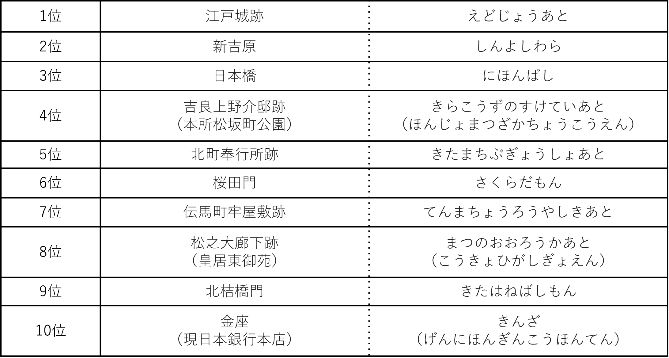 江戸城跡、新吉原、日本橋と江戸時代を象徴する名所が3位までを占めました。以下、桜田門外の変が起きた「桜田門」や、本アプリでも22年秋にスタンプラリーのテーマとして取り上げた「忠臣蔵」関連のスポットなど、歴史的事件に関連するものが多くランクインしています。また10位の「金座」は、22年6月にテレビ番組で本アプリを取り上げていただいた際に番組と同じスポットを検索された方が急増したことから、年間ランキングでも上位に入りました。