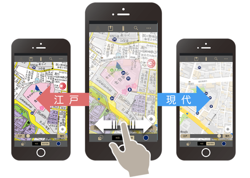 江戸末期の古地図を、人の手による「完全描き起こし」で再現。さらに地図の透過度を自由に変えられる機能も搭載し、スマホ上で容易に現代図と古地図を重ね合わせることができます。スマートフォンや、タブレットでご利用可能です。
