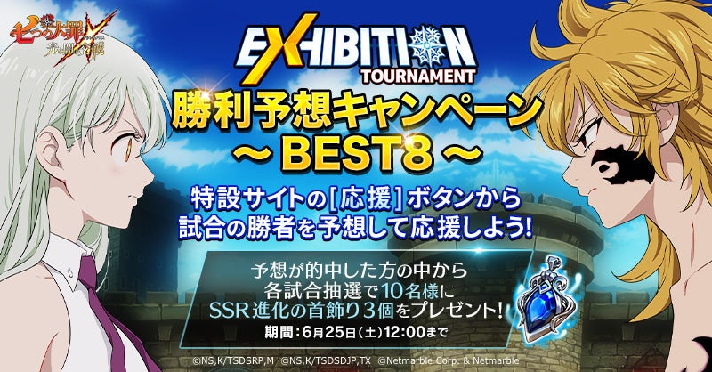 「エキシビショントーナメント」BEST8の勝利プレイヤーを予想して応募してください。予想が的中した方から各試合抽選で10名様(合計40名様)にSSR進化の首飾り3個をプレゼントいたします。