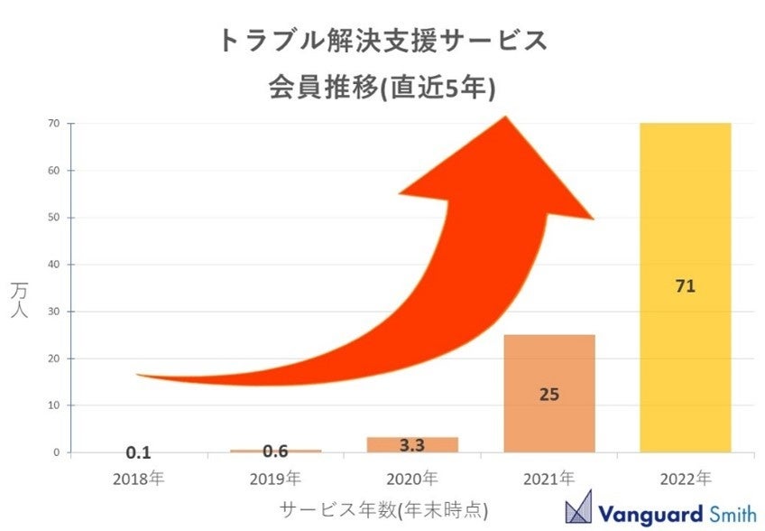 当社主要事業として展開しているトラブル解決支援サービス「mamorocca」「Pサポ」は、2015年のサービス開始から7年で、会員数は全国71万人(2022年12月末現在)に上っています。直近1年間では、2021年12月末の会員数約25万人から約3倍に急増しています。