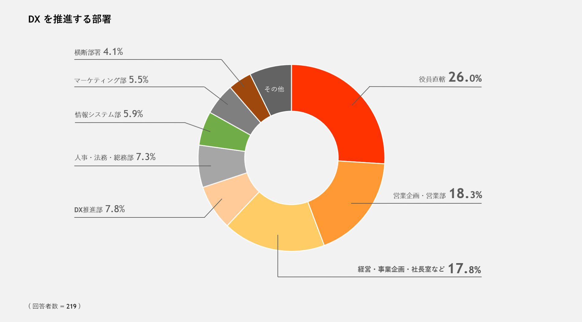 DX推進の担当部署について質問したところ、「役員直轄」が最も多く26.0%で、次いで18.3%が「営業企画・営業部」、17.8%が「経営企画・事業企画・社長室」と回答しました。また「DX推進部」という専門部署があり、そこが担当しているというケースも7.8%ありました。