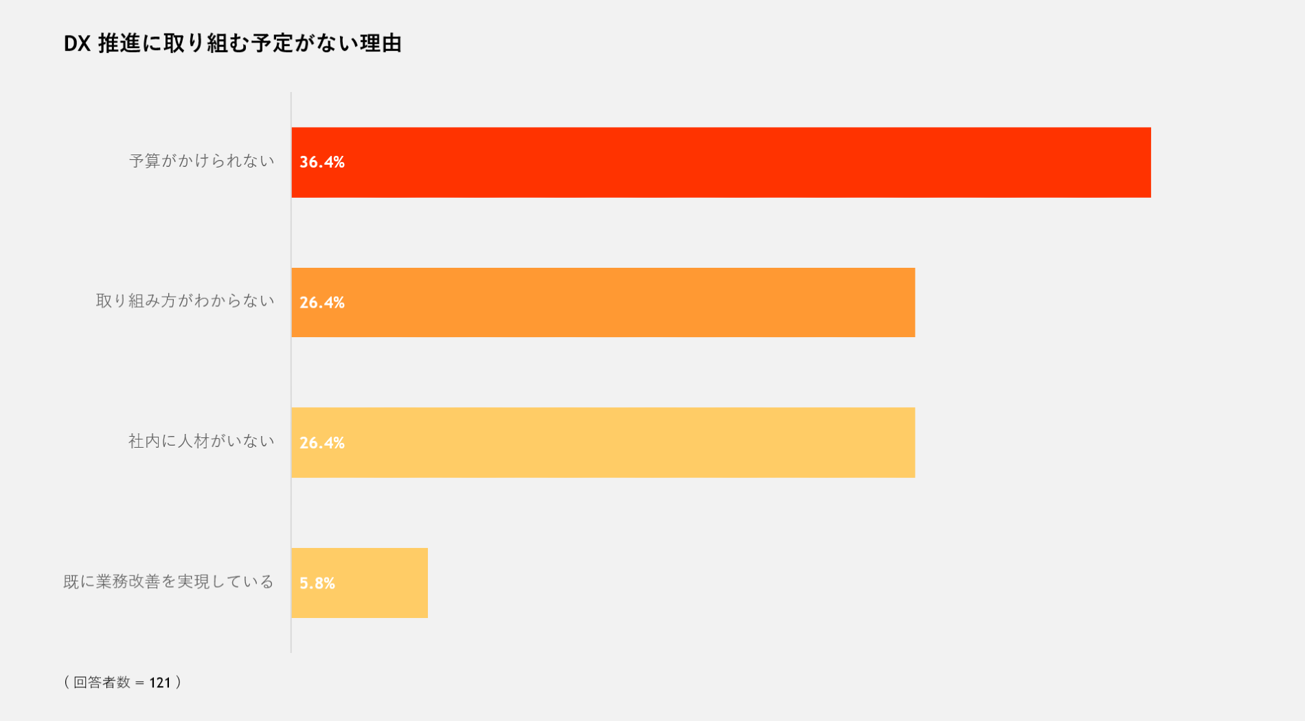 また、「DXに取り組む予定がない」と回答した企業に「取り組む予定がない理由」を確認した質問でも、「予算の確保」「取り組み方がわからない」「DX人材の確保」が課題となっていることがわかりました。