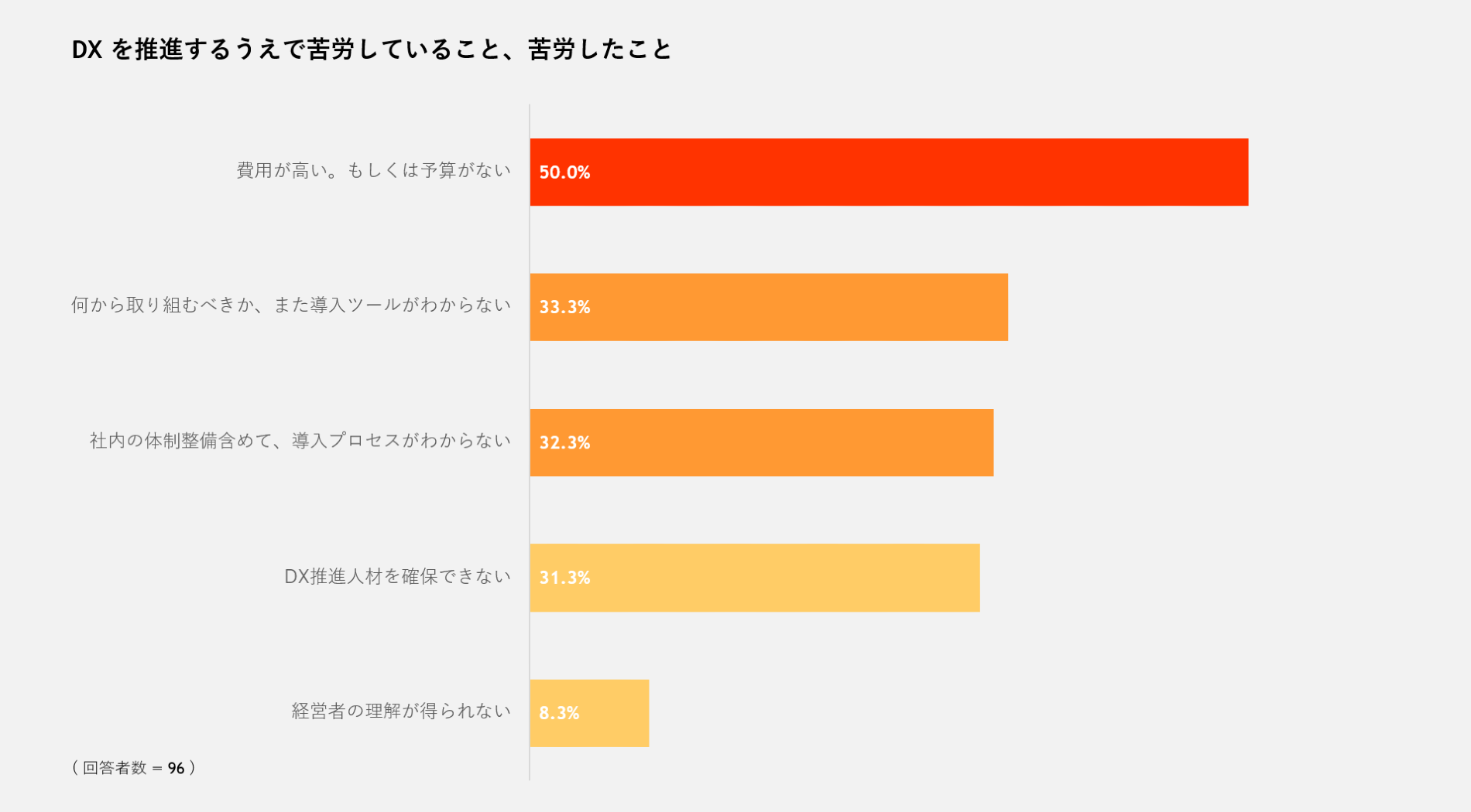 「DXを推進するうえで苦労していること(苦労したこと)」を質問したところ、「予算の確保」「DX人材の確保」「(社内体制整備含め)導入プロセスがわからない」の3つがいずれも30%以上となりました。