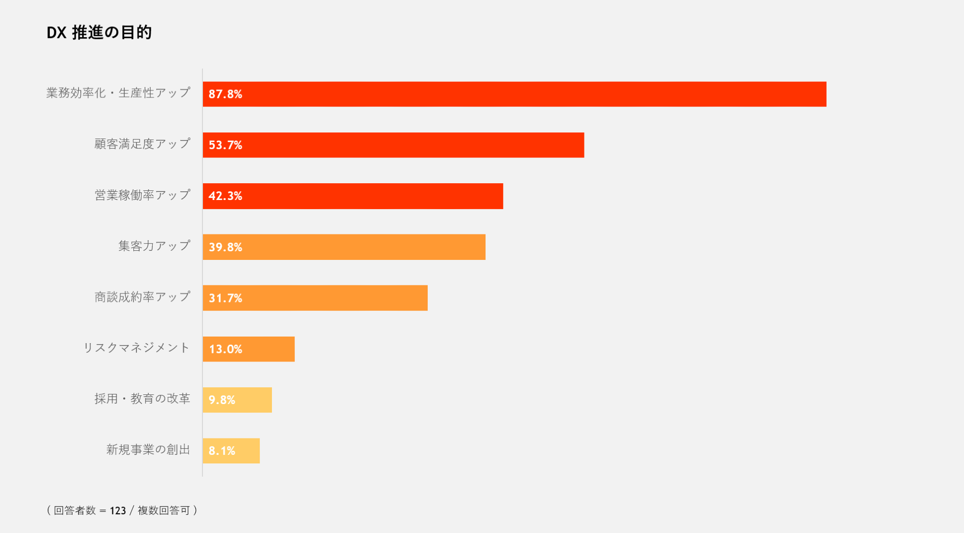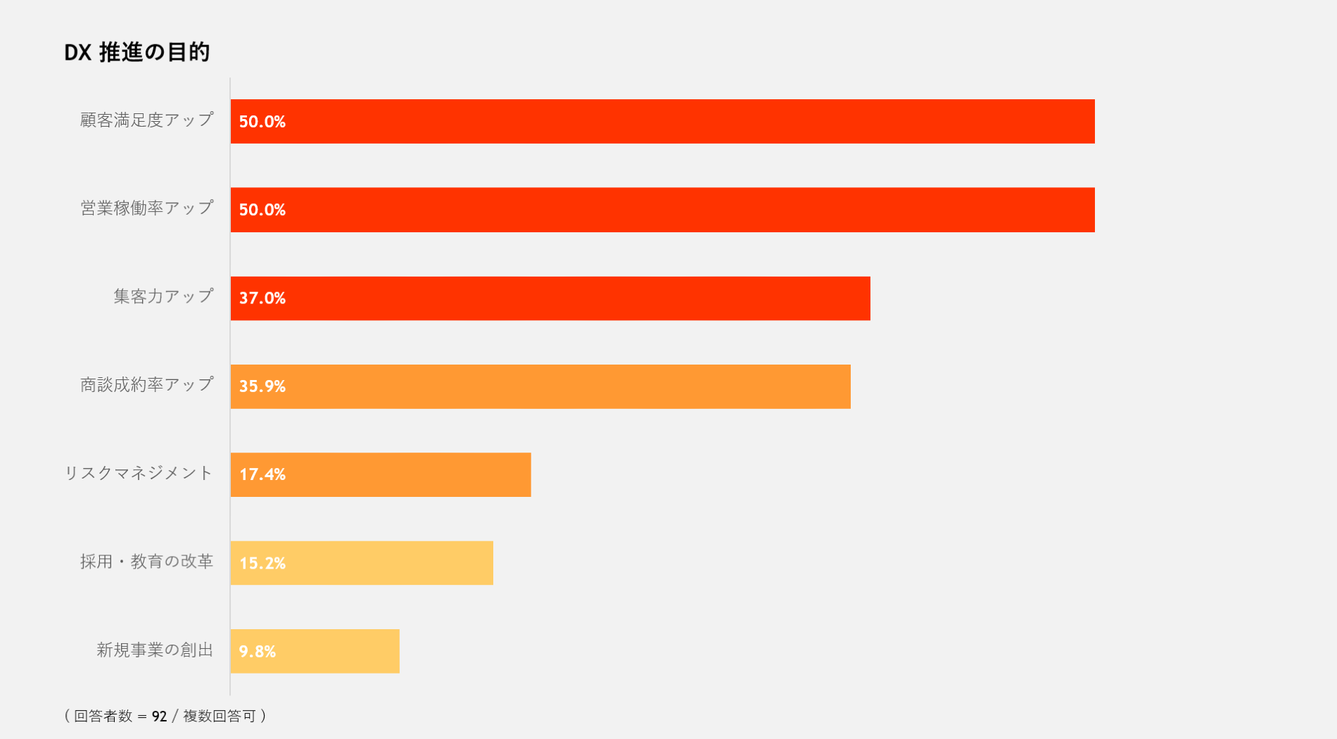 DX推進の目的について質問したところ、「顧客満足度アップ」「営業稼働率アップ」が最も多く、次いで「集客力アップ」が37.0%の回答となりました。