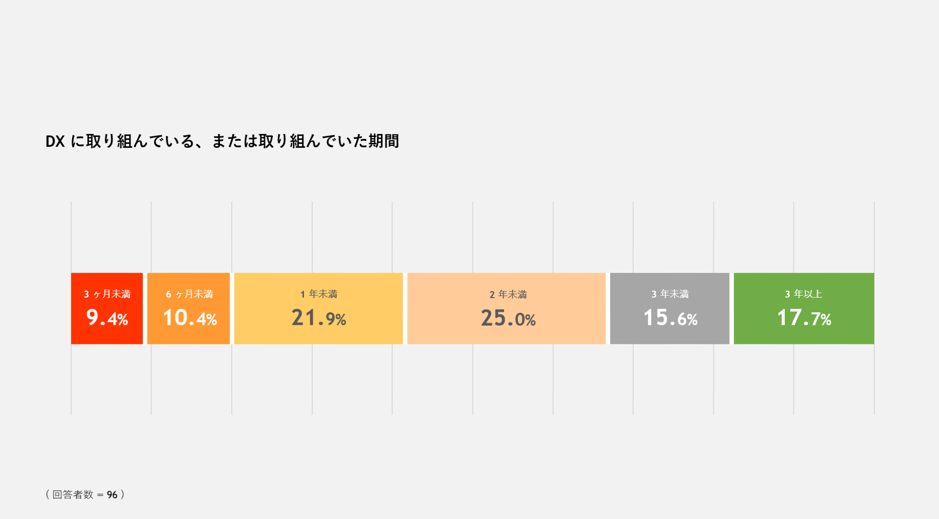 「3ヶ月未満」「6ヶ月未満」含む直近1年以内でDXの取り組みを開始した企業は41.7%で、大きく増加したことがわかります。