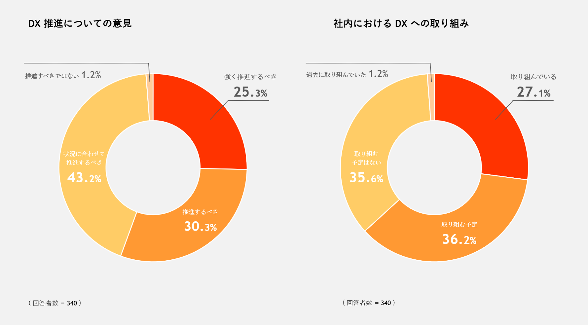 「DX推進についての意見をお教えください」という質問に対し、強く推進すべきだと思う・推進すべきだと思う・状況にあわせて推進すべきだと思う、をあわせると「推進すべき」という意見は98.8%に上りました。また、「御社はDXに取り組まれていますか?」という質問に対し、64.4%が「実際に取り組んでいる(いた)・取り組む予定」と回答しました。