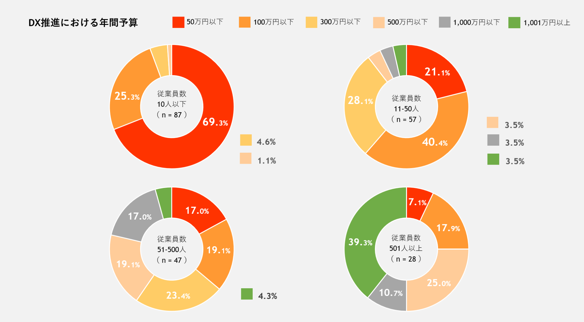 ・DX年間予算は従業員10名以下では「50万円以下」、11-50名以下では「100万円以下」、従業員51名以上では「300万円以下」、従業員501名以上では「1,001万円以上」が最多