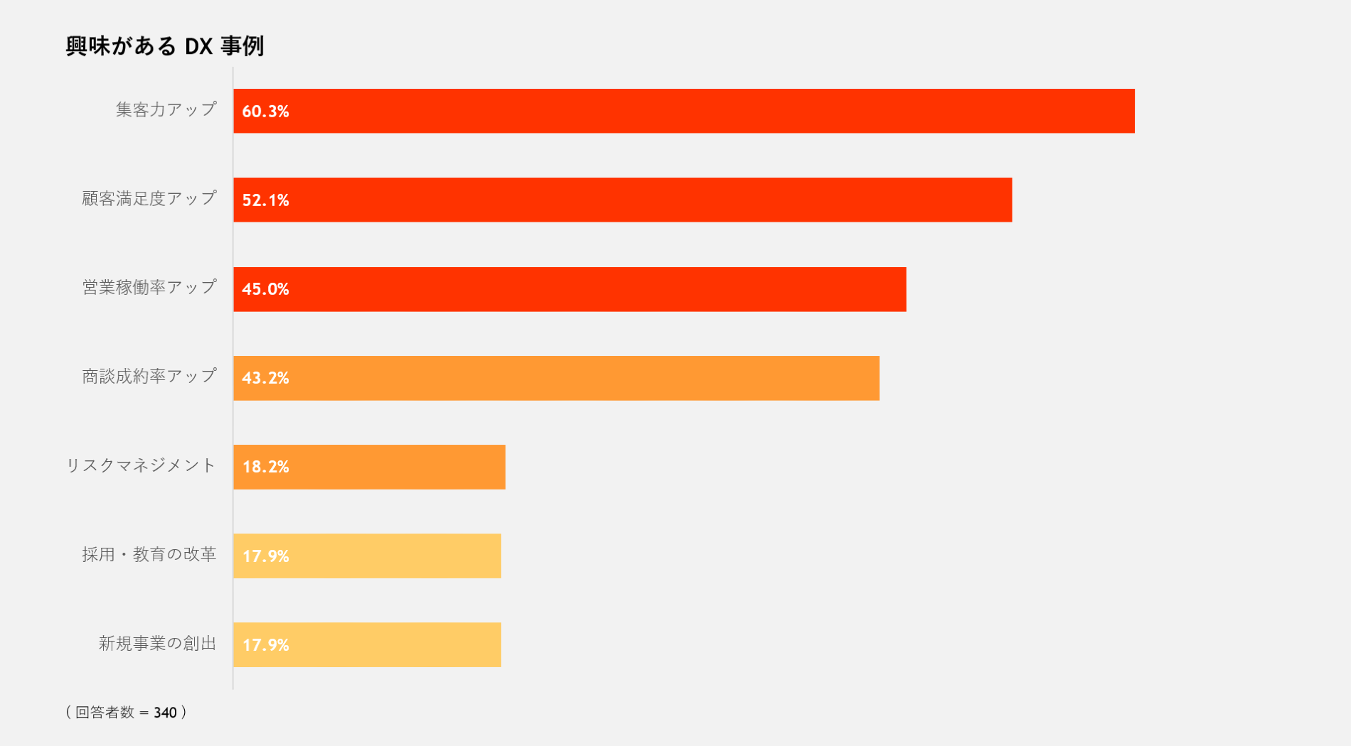 また、全ての回答者に興味があるDXの取り組み事例を質問したところ、60.3%が「集客力アップ」、52.1%が「顧客満足度アップ」、45.0%が「営業稼働率アップ」、43.2%が「商談成約率アップ」と回答。営業マーケティングのDX事例に興味を持たれる方が多いことがわかりました。