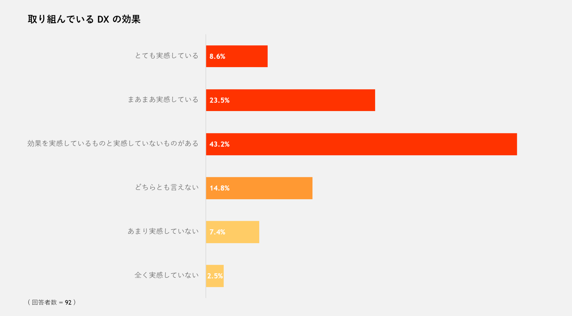 また、DXの効果について質問したところ、とても効果を実感している・まあまあ効果を実感している・効果を実感しているものと実感していないものがある、をあわせると「効果を実感している」という意見が75.3%になりました。