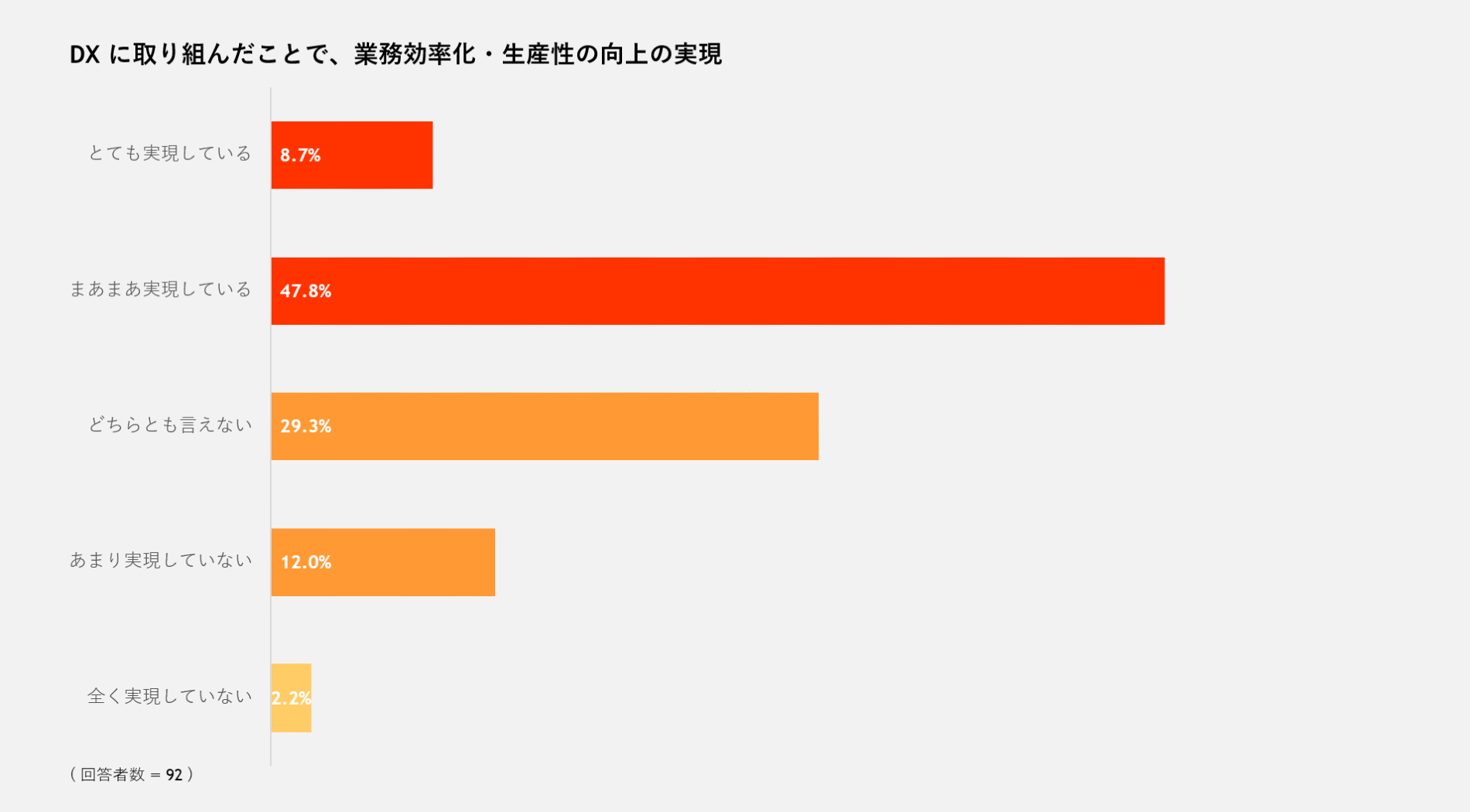 「DX推進によって業務効率化・生産性向上が実現したか」という質問に対して、とても実現している・まあまあ実現している、をあわせると「実現している」という意見は56.5%に上りました。
