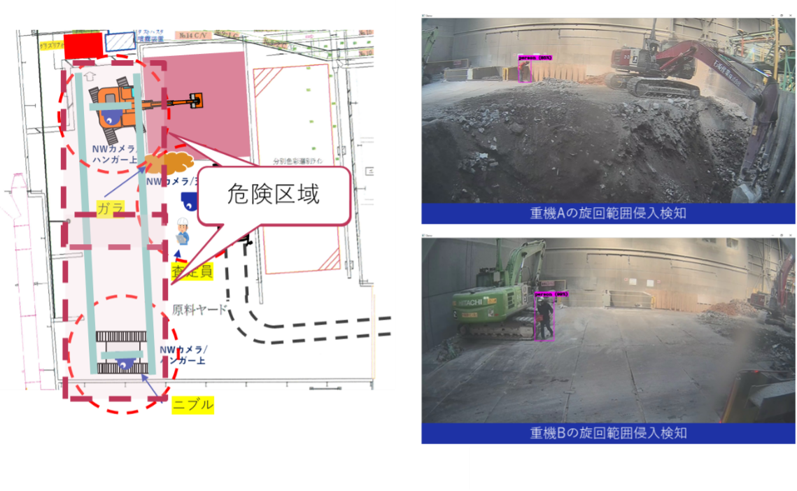 プラント内の危険区域に接近した人物を映像解析AIで常時把握するともに、重機のエンジンの状態をモニタリングすることで、リスクを可視化しました。管理者が遠隔で現場を確認できることで、接触事故のリスク低減とさらなる安全性の担保が可能となりました。